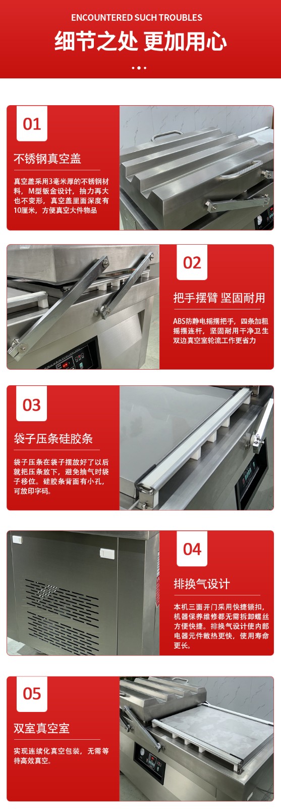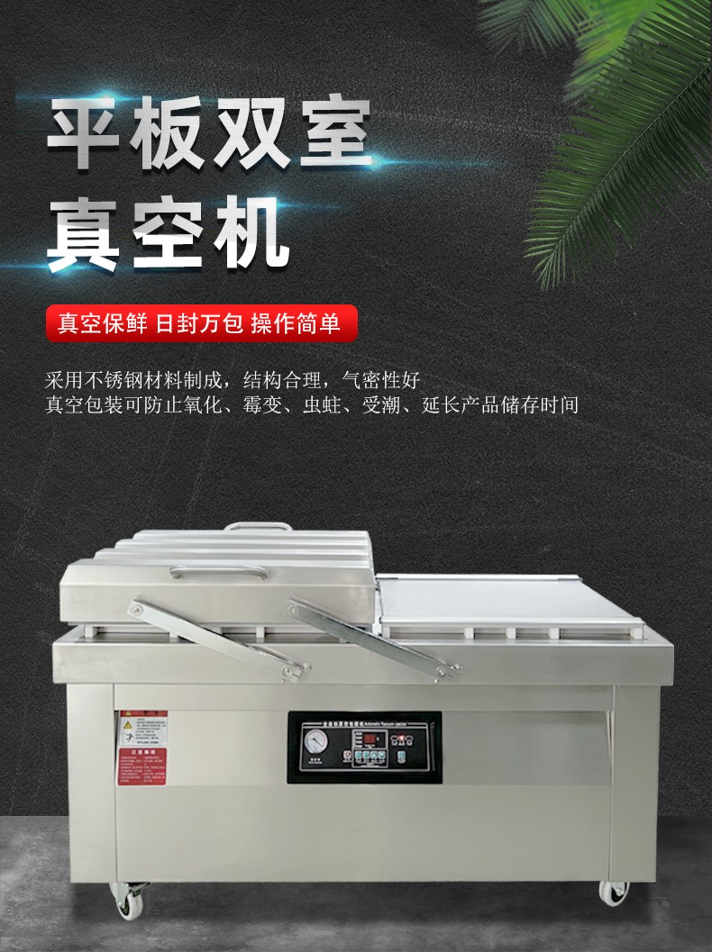 通過這種 “交替作業” 模式,雙室機無需等待單個室的完整流程結束即可開始下一批包裝,效率比單室機提升 60%-100%,同時雙泵 + 雙室獨立密封的設計,也保障了每一批次物料的真空度與密封性穩定。