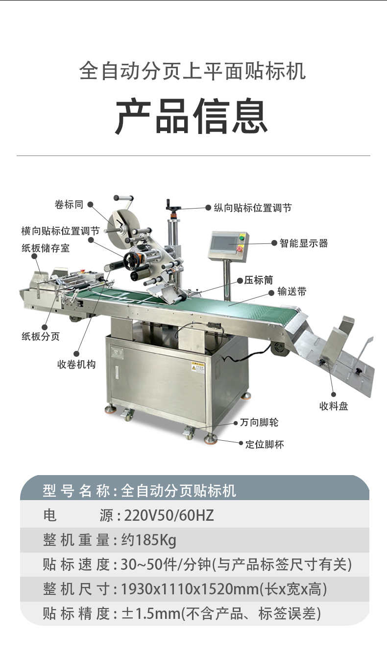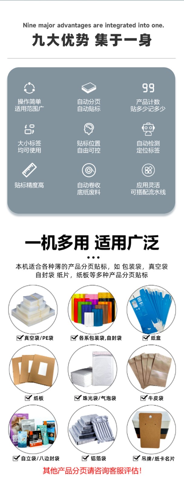 東莞市中堡智能科技實業有限公司的全自動分頁貼標機:可應用于紙片、名片、標簽、各種材質的卡片、電話卡、IC 卡、IP 卡、游戲沖值卡、塑料復合包裝袋、紙盒片、紙袋等各種厚度各種材質的片狀物品的自動分頁,并進行貼標。以 ±1mm 超高精度和 0-100 個 / 分鐘的極速性能,支持多種標簽類型,廣泛應用于電子、五金、塑膠、化工等行業。