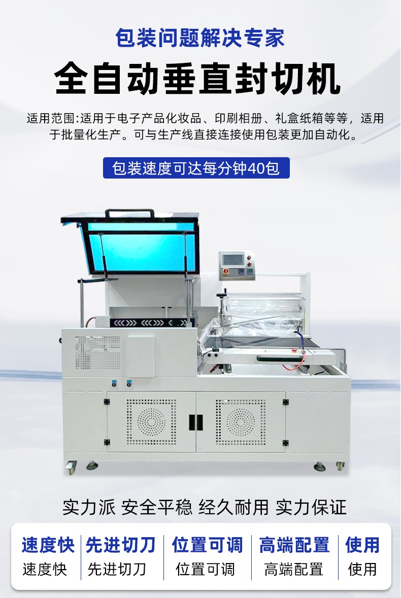 全自動垂直封切熱收縮包裝機憑借高效自動化、封口平整、適用范圍廣的特點,適配多行業的產品包裝需求,尤其適合需要批量包裝、追求外觀整潔或需防潮防塵防護的物品。垂直封切上下驅動,封口均勻無折皺,適合高度方向尺寸大的產品;L 型封切效率更高,適合扁平小件批量包裝。