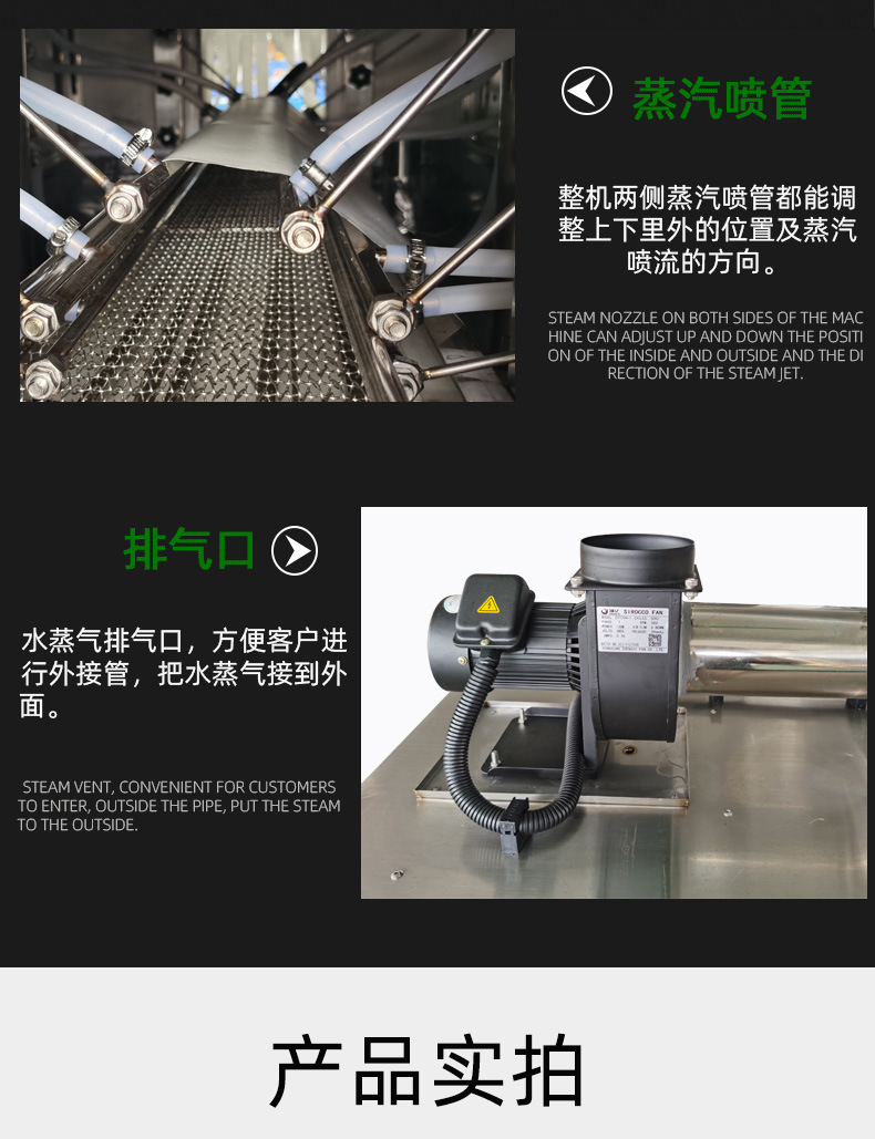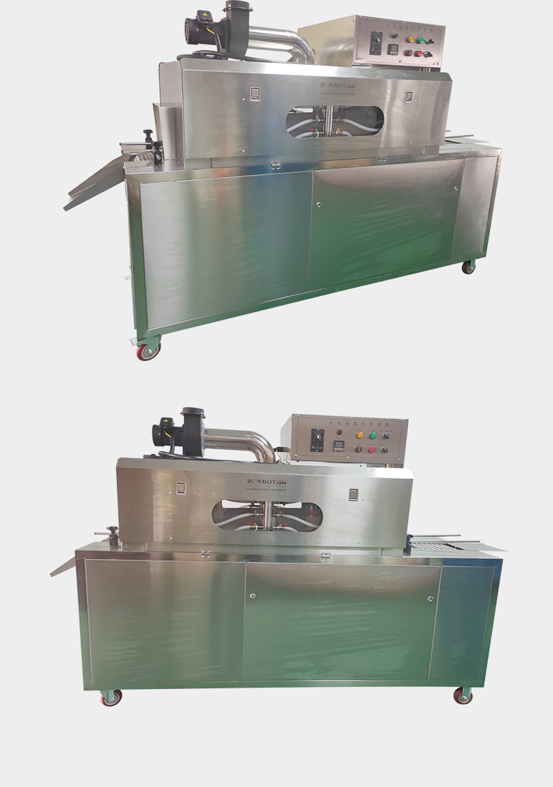 收縮階段:包裝好的產(chǎn)品接著被輸送到蒸汽收縮部分的收縮通道入口。此時,蒸汽發(fā)生系統(tǒng)已經(jīng)產(chǎn)生了合適的蒸汽,蒸汽通過噴頭均勻地噴灑在產(chǎn)品的包裝薄膜上。包裝薄膜在蒸汽的熱量作用下開始收縮,緊密貼合在產(chǎn)品表面。產(chǎn)品在輸送系統(tǒng)的推動下繼續(xù)在收縮通道內(nèi)移動,保證薄膜各個部分都能充分收縮。收縮完成后,通風(fēng)口排出蒸汽,產(chǎn)品在外界環(huán)境下冷卻定型,最終完成蒸汽收縮包裝,從出口輸送帶送出一體機(jī)。