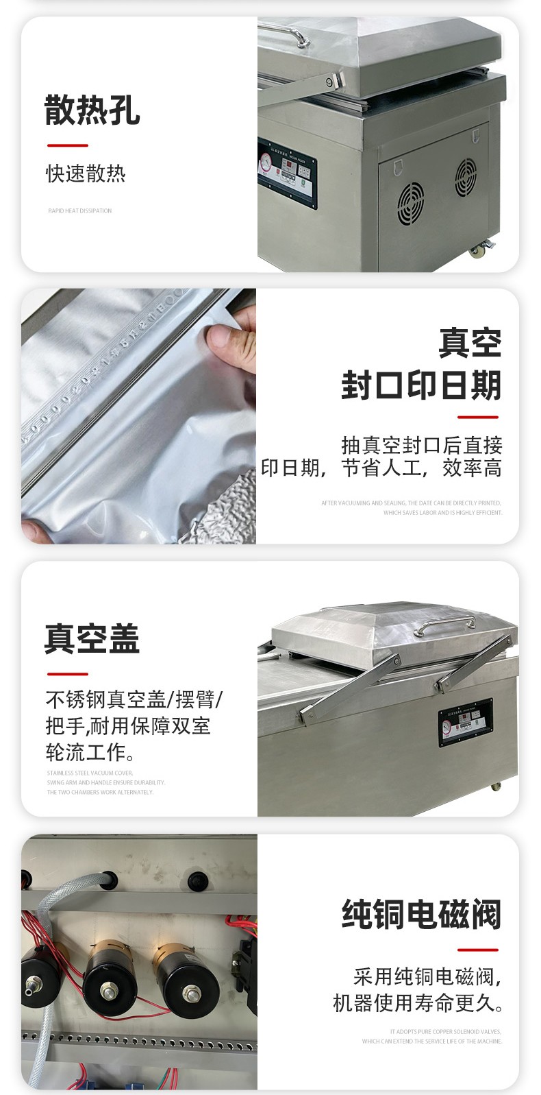 - 真空室:通常由不銹鋼制成,具有兩個對稱的工作室,可同時進行真空包裝操作,提高工作效率。工作室底部為平板狀,便于放置包裝物品,且易于清潔。