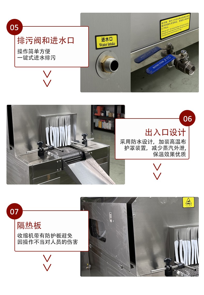 設備的結構設計圍繞 “蒸汽產生 - 加熱收縮 - 產品輸送 - 參數控制” 展開,核心部件包括四大模塊: