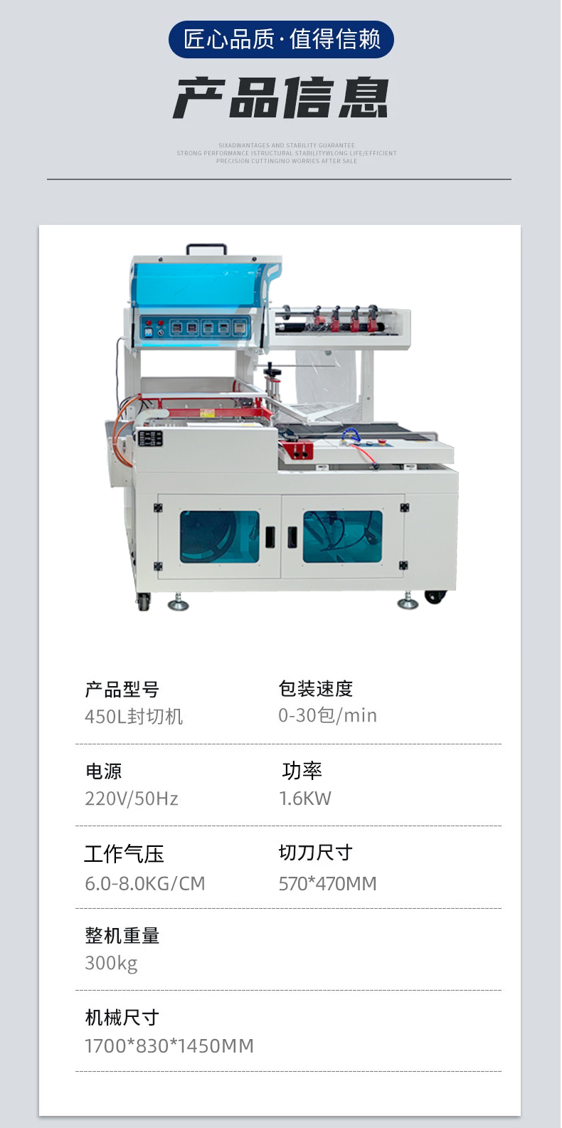 - L 型封切刀(由橫向刀和縱向刀組成,呈 “L” 形)快速下壓,同時通過 “熱封 + 切斷” 一體化動作:先通過加熱條將膜的重疊處熱封(形成密封的 “膜袋” 套住產品),再通過內置切刀切斷多余膜料,完成 “套膜” 工序;